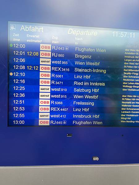要回國的前一天我們從哈修塔特回到維也納中央車站,接著要從中央車站坐ÖBB 火車到機場,因為最後一晚我們住的飯店是在機場附近,我在App輸入起始站「Wien」,結果在中央車站的告示牌時刻表上怎麼樣都找不到這個車班,我才發現如果輸入「Wien」並不是從中央車站出發,而是從另外一個車站,這時我才恍然大悟,都要回國了才搞清楚狀況😅